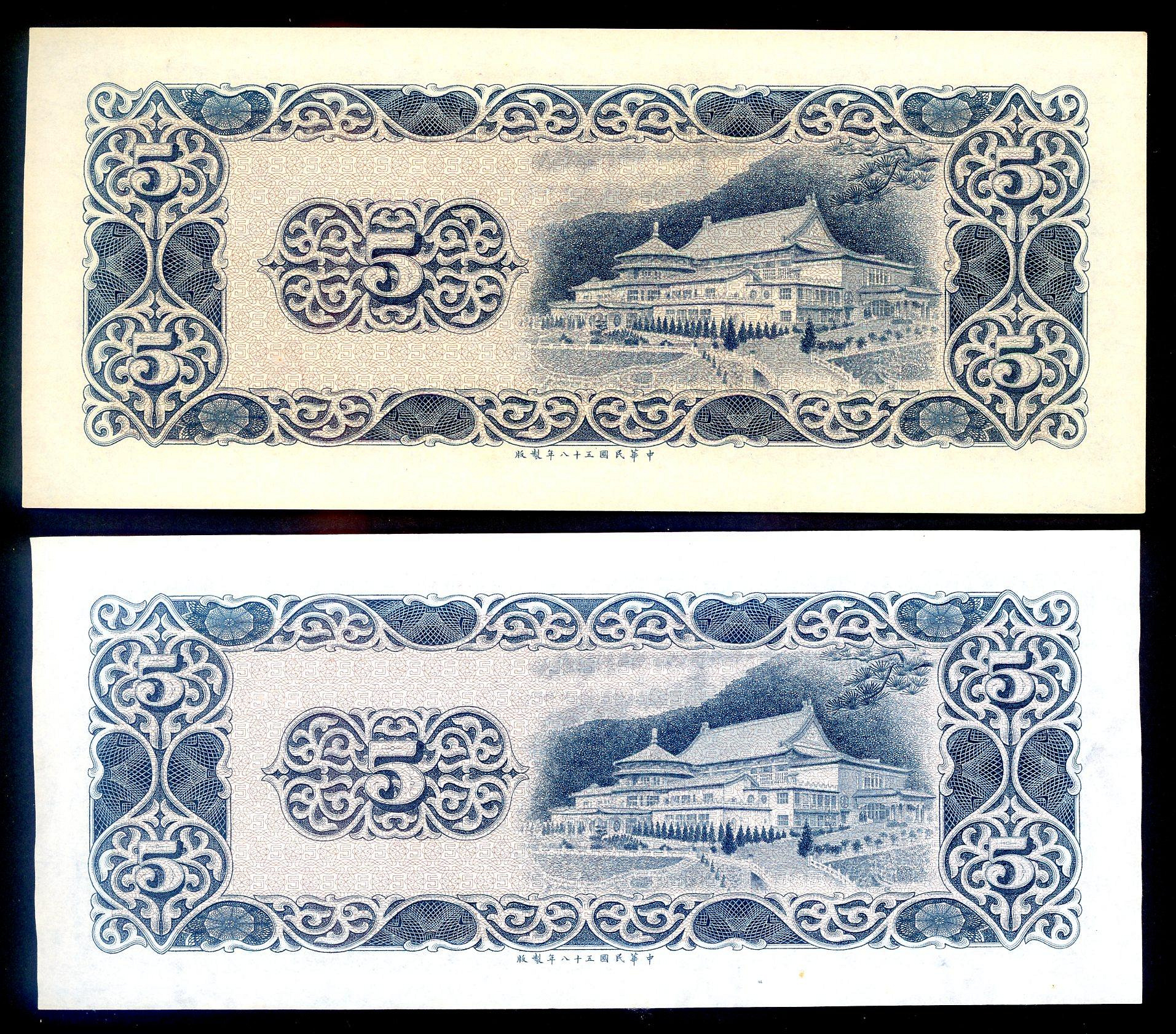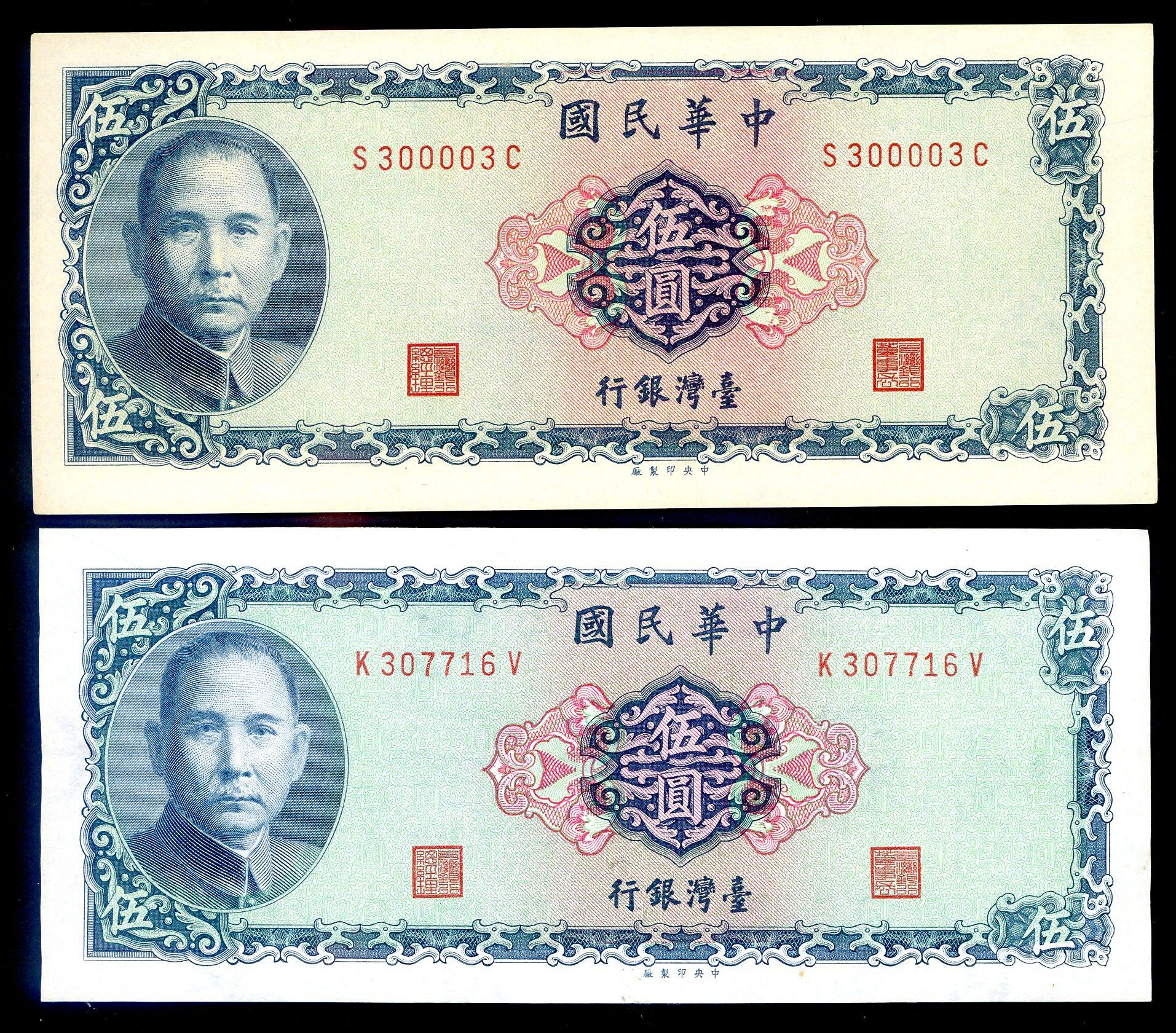 臺灣銀行58年伍圓藍色鈔券2張-97新含壹趣味號S300003C