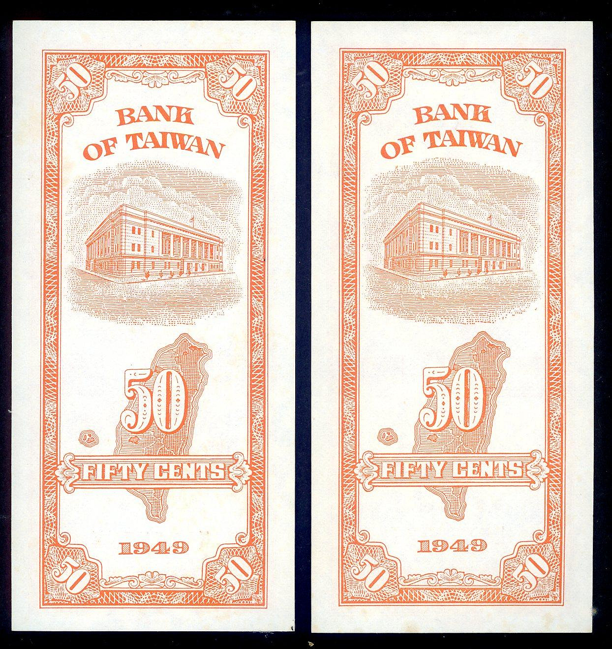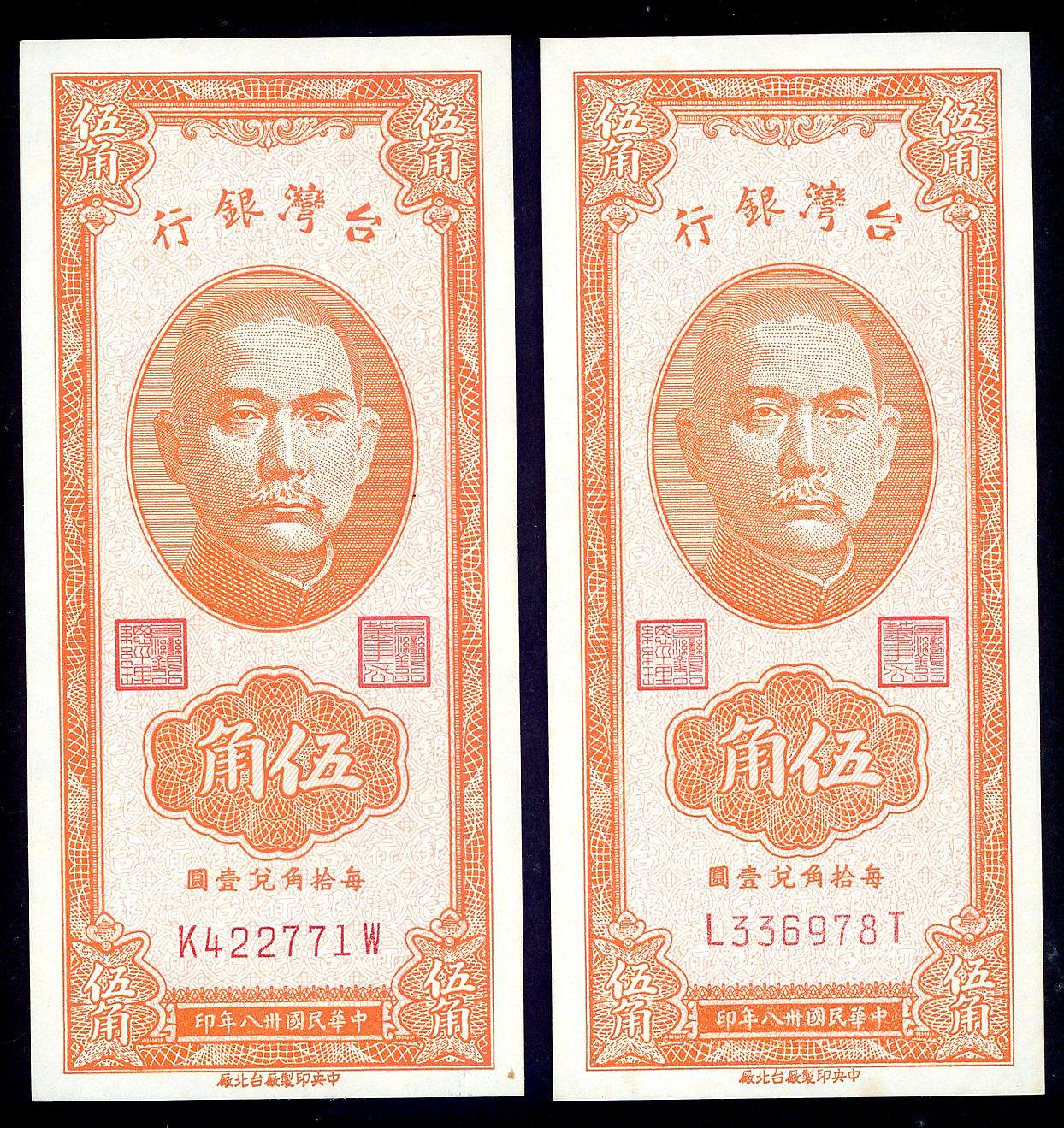 臺灣銀行38年伍角鈔券2張-98新無折